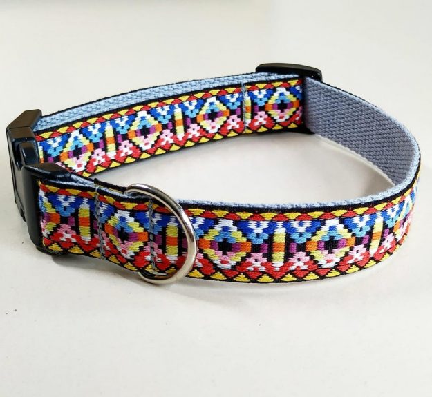 Un collar per Elly !! Descripció : Talla L – de 40 a 55 cms De 2,5 cms d’amplada. Collar a 40 cms de circunferència. Confeccionat amb cinta de cotó amb passamaneria. Model amb tanca click.