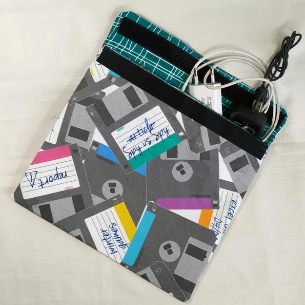 De Quan la tecnologia d’aquells temps de la prehistòria informàtica es barregen amb l’actual 2.0, simplement per poder portar bateries i cables en una bosetta «Floppy style». Descripció Confeccionat amb doble tela de cotó 100% Tanca de velcro. Mides de 23 x 22 cm